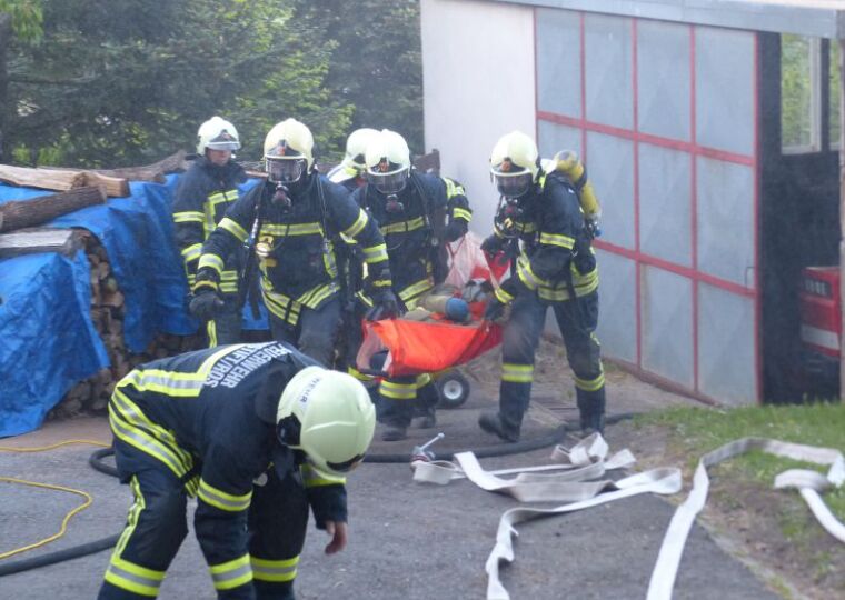 Unter schwerem Atemschutz konnte die vermisste Person nach kurzer Zeit gefunden werden und ins freie transportiert werden, wo sich Feuerwehrmitglieder um sie kümmerten. Weit er´s wurden die Gasflaschen geborgen und mittels C-Rohr gekühlt.