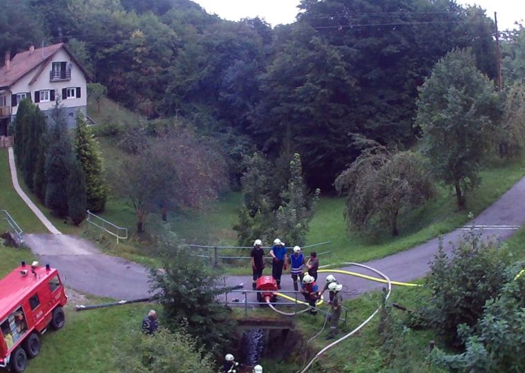 In weiterer Folge wurde die Wulka aufgestaut und mit der Tauchpumpe die Tragkraftspritze mit Wasser versorgt, diese pumpte das Löschwasser weiter über das TLF zum Brandherd.