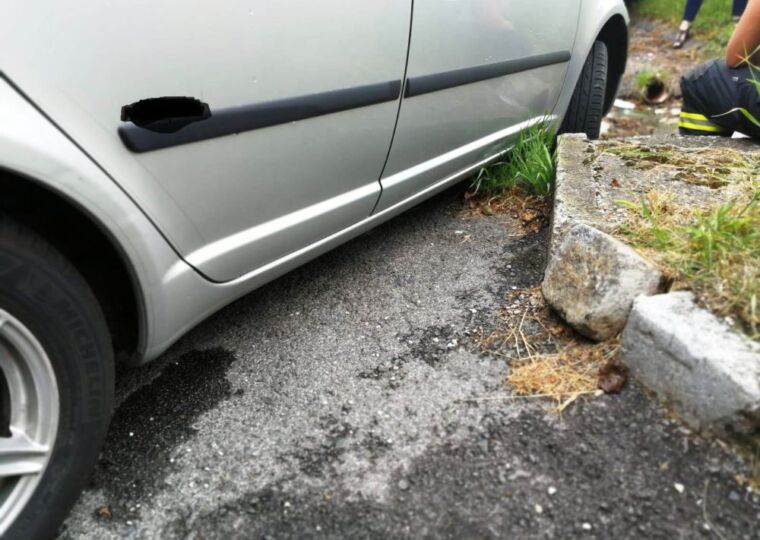 Ein PKW kam, aus ungeklärter Ursache, in eine Regenrinne und blieb hängen.