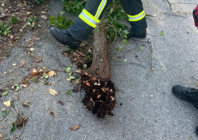 Nach einer umfassenden Erkundung der Einsatzstelle entschied das Feuerwehrteam, den auf dem Dach liegenden Baum mithilfe einer Seilwinde zu entfernen. Während des Einsatzes wurde festgestellt, dass die Dacheindeckung durch den Vorfall beschädigt wurde und ein Loch aufwies.