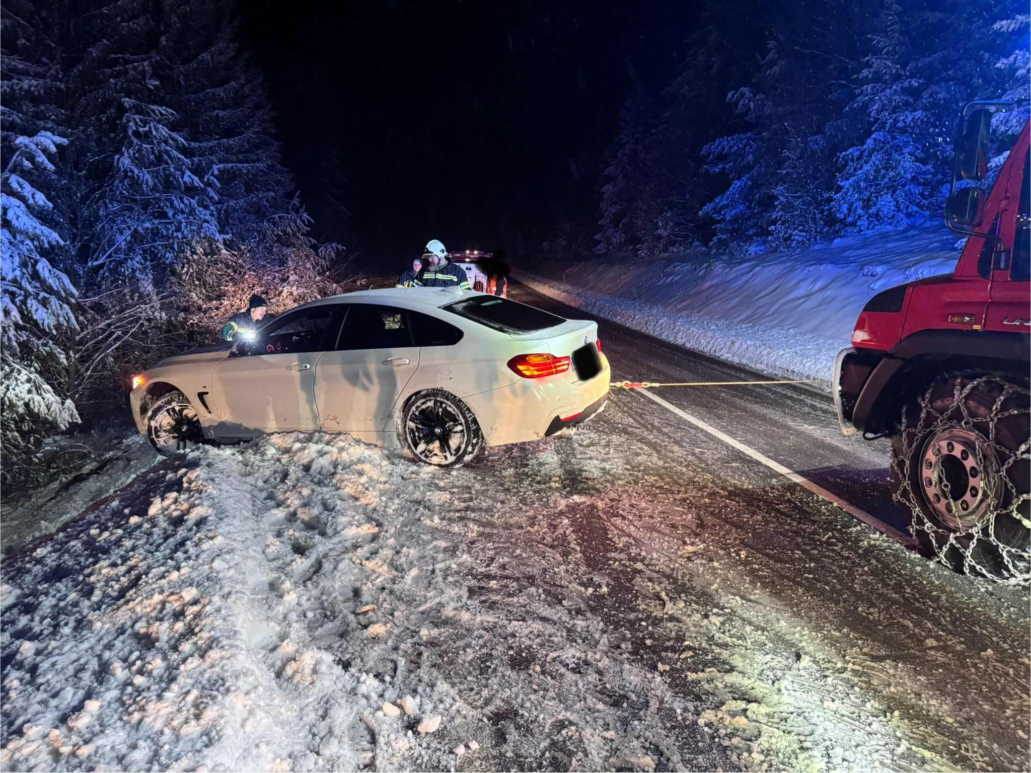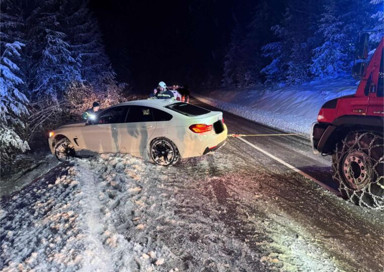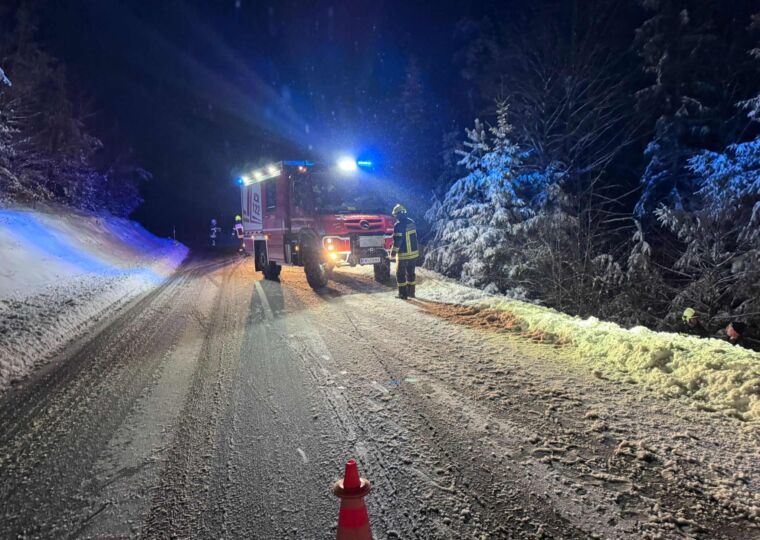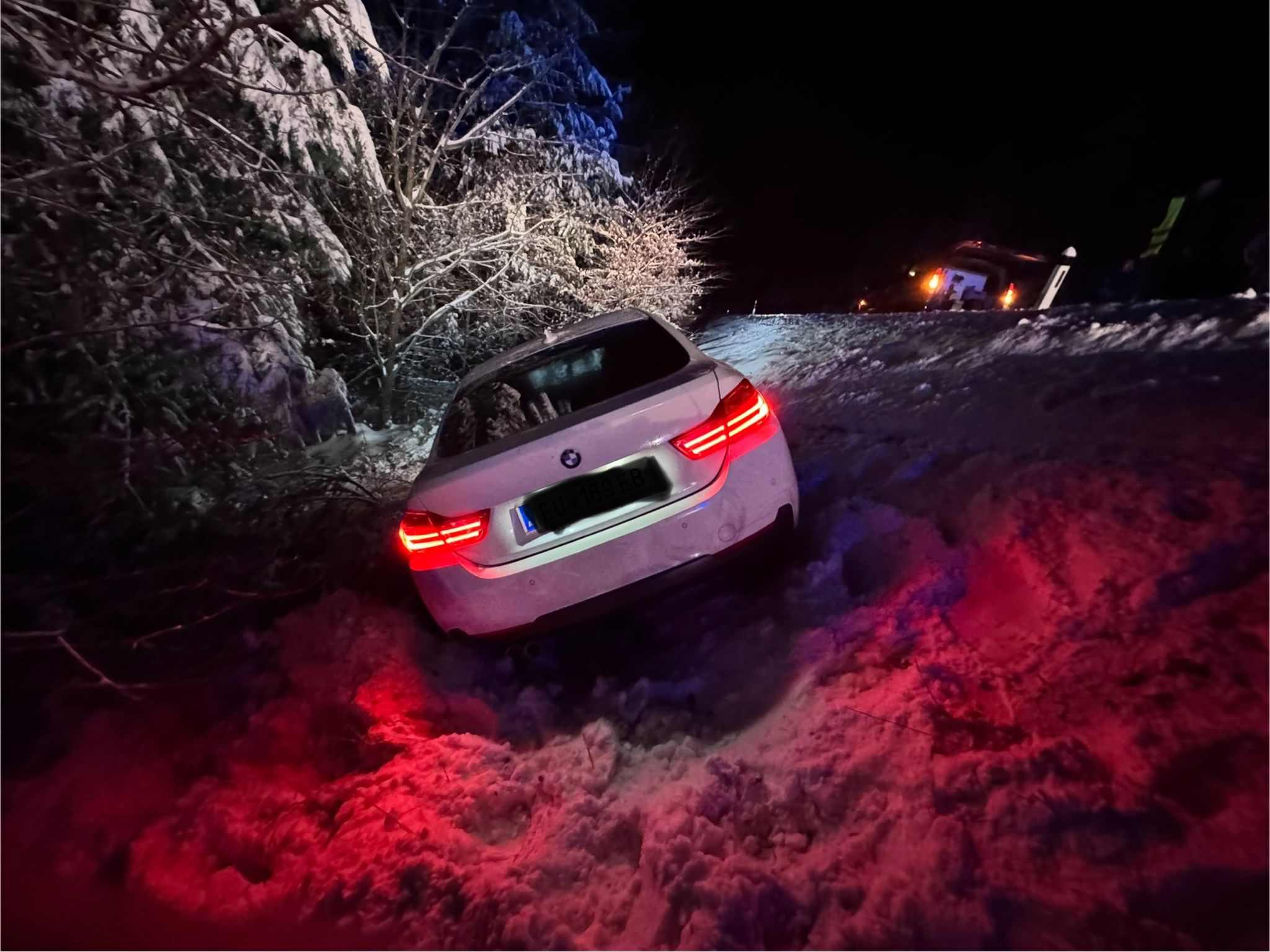 An der Einsatzstelle zeigte sich, dass ein PKW von der Fahrbahn abgekommen war und im verschneiten Straßengraben zum Stillstand kam. Zum Glück blieben alle Fahrzeuginsassen unverletzt.