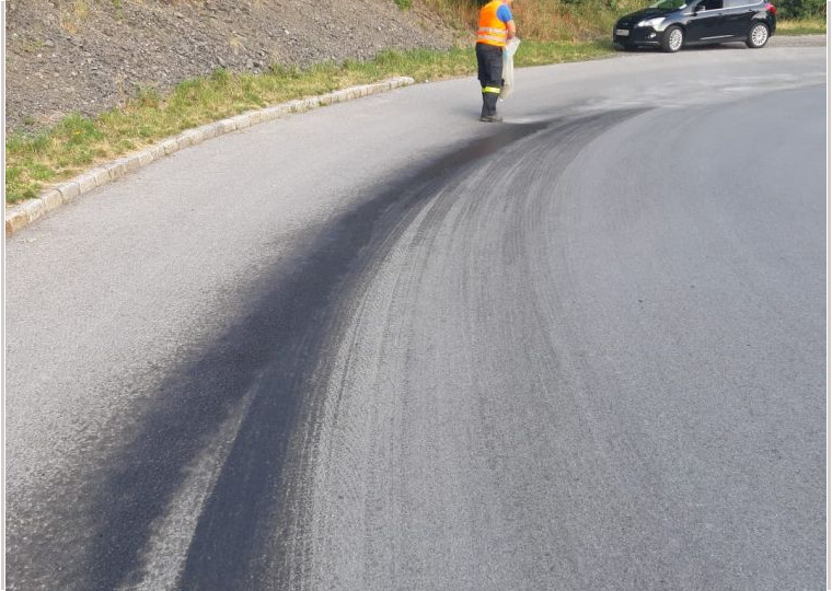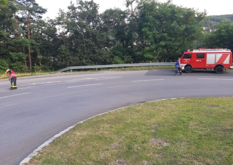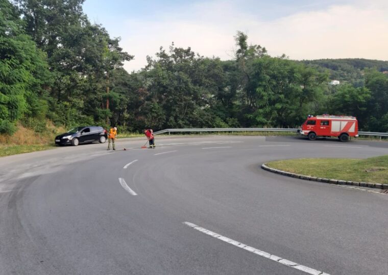 Die Feuerwehr Neustift an der Rosalia rückte mit zwei Fahrzeugen und rund zehn Mitglieder aus, um die Ölspur mit Bindemittel zu binden.